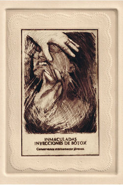 This project meets an installation of etchings inspired by antique holy cards. Reinterpreting traditional catholic prayers and iconography, each piece worships the various cosmetic procedures and beauty regimes revered in Colombian society. Besides the original etchings, viewers encounter an installation of digitally printed copies on which they can write a petition or gratitude regarding their personal beauty needs. As the central part of the exhibition, and referencing the traditional catholic custom, viewers then hang their prayers within the installation. Faithful to my current inquiry into expanding the possibilities of printmaking through installation projects, I undertook the concept of votive images, as a social exercise where the public could leave a testament of their thoughts regarding personal aesthetic enhancement, and in turn the prayers themselves become material for the exhibition. The prayers have been written anonymously by the public and I collected them as a tool for understanding the perceptions and reactions about beauty in Colombia.